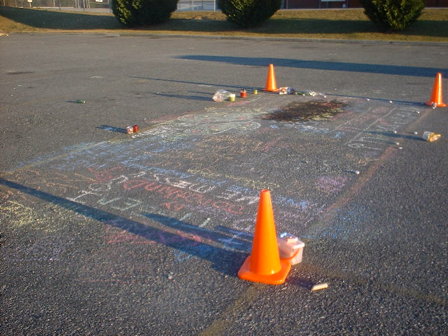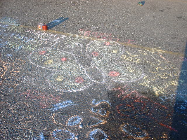 KRISTIN'S PARKING SPACE AT SCHOOL. THEY HELD CANDLELIT VIGILS 4 NIGHTS IN A ROW THE WEEKEND OF HER ACCIDENT. THE FRIENDS LIT CANDLES AND WROTE LOVING WORDS WITH COLORED CHALK IN HER SPACE. I CAN EASILY SPOT HER SPACE WHEN GOING BY THE SCHOOL BECAUSE OF THE OIL LEAK SHE HAD :o)